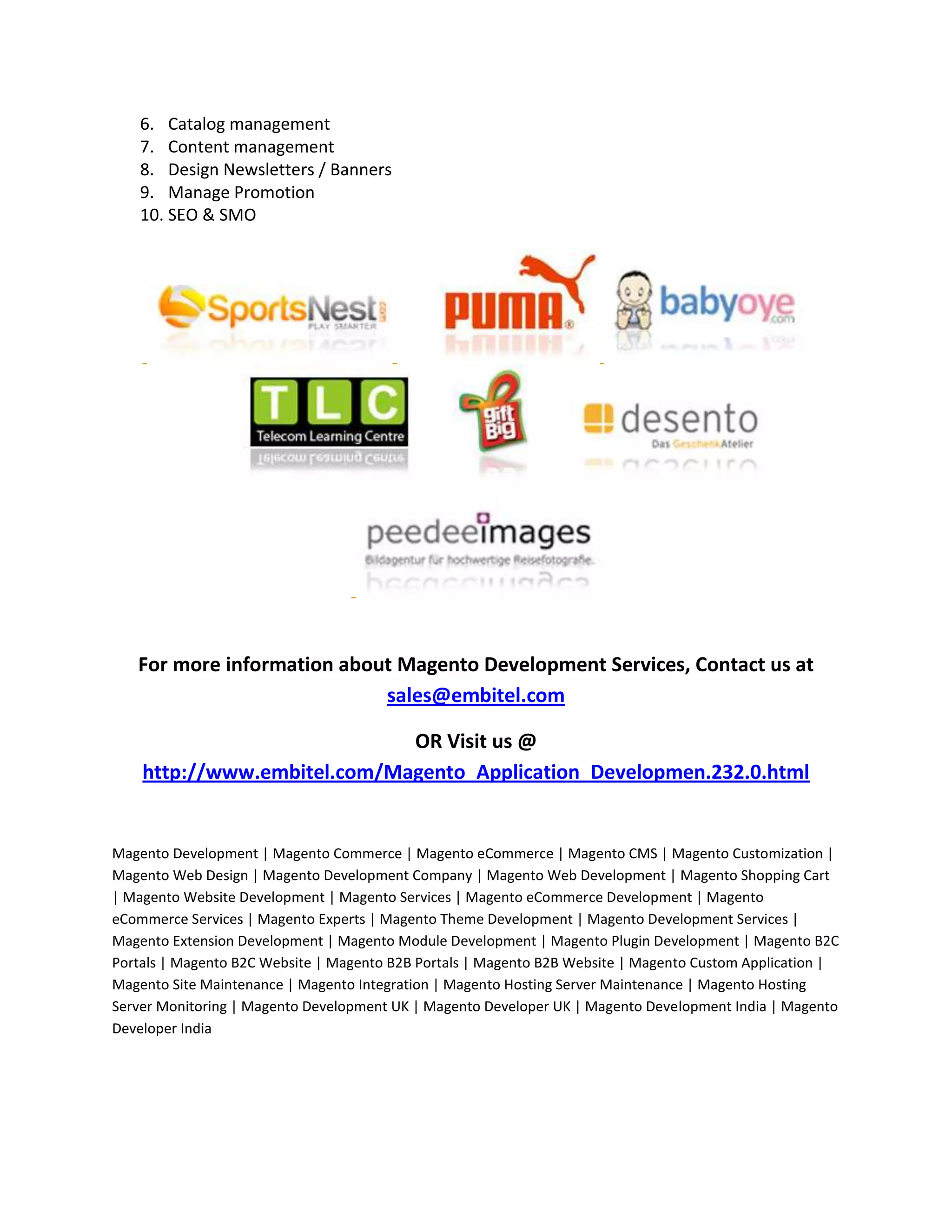 Embitel is a leading provider of Magento eCommerce development services including web design, development, customization, extensions, integrations, optimizations, and ongoing maintenance. They consult with clients to determine the best platform and evaluate their needs to recommend a suitable solution. Their expert Magento team enhances solutions through front-end and back-end development focused on brand and user experience. In addition to website launches, they offer ongoing services like server monitoring, application monitoring, redevelopment, extensions, integrations, catalog management, content management, promotions, SEO, and SMO.