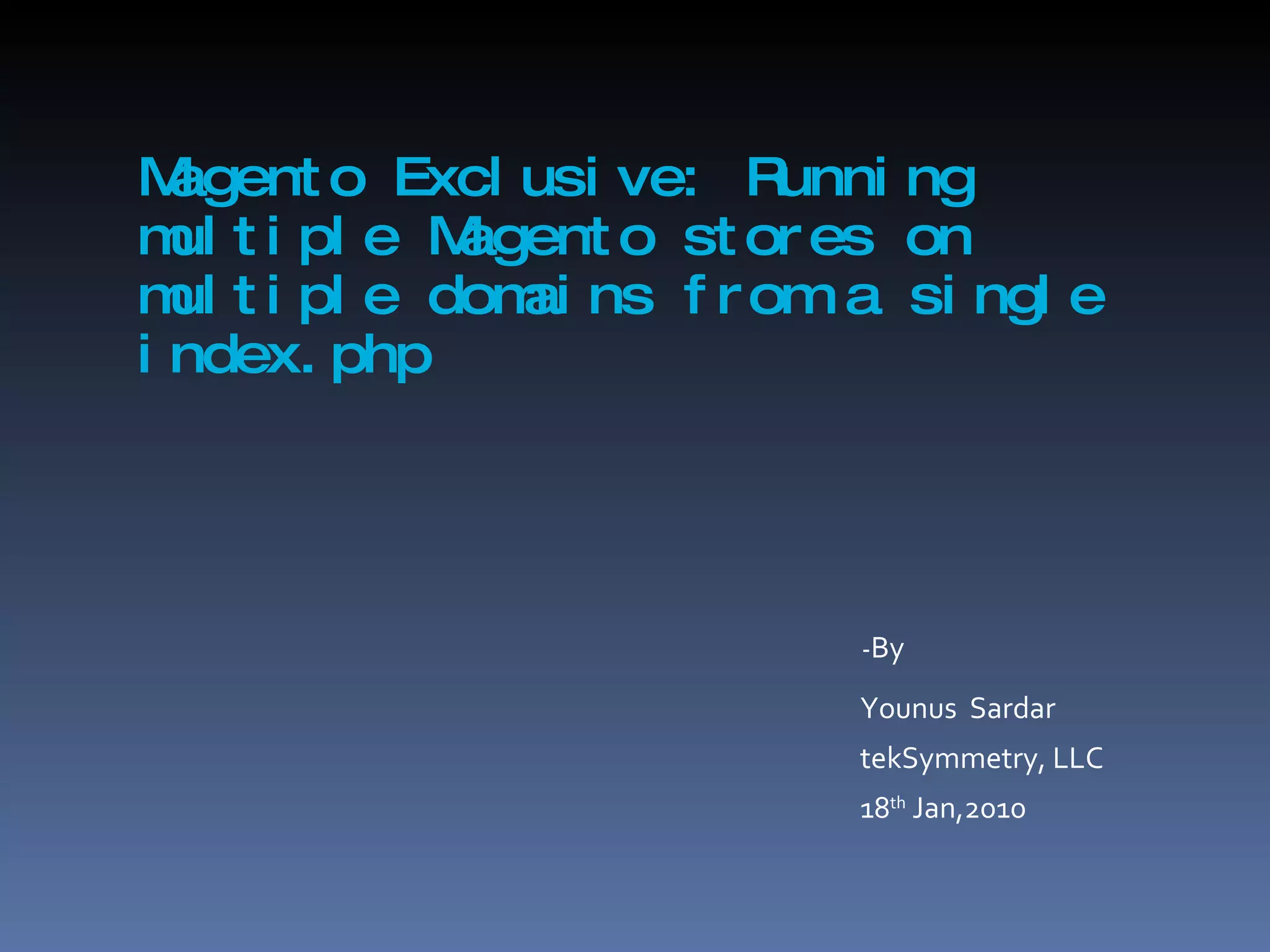 Magento allows running multiple online stores on different domains from a single Magento installation. This is done by setting up multiple websites, stores, and store views in the Magento admin panel. Products and categories can then be assigned to specific websites. The document provides steps for configuring additional websites, assigning URLs, adding products to each website. This allows selling the same products to different customer groups through different brand websites running on different domains.