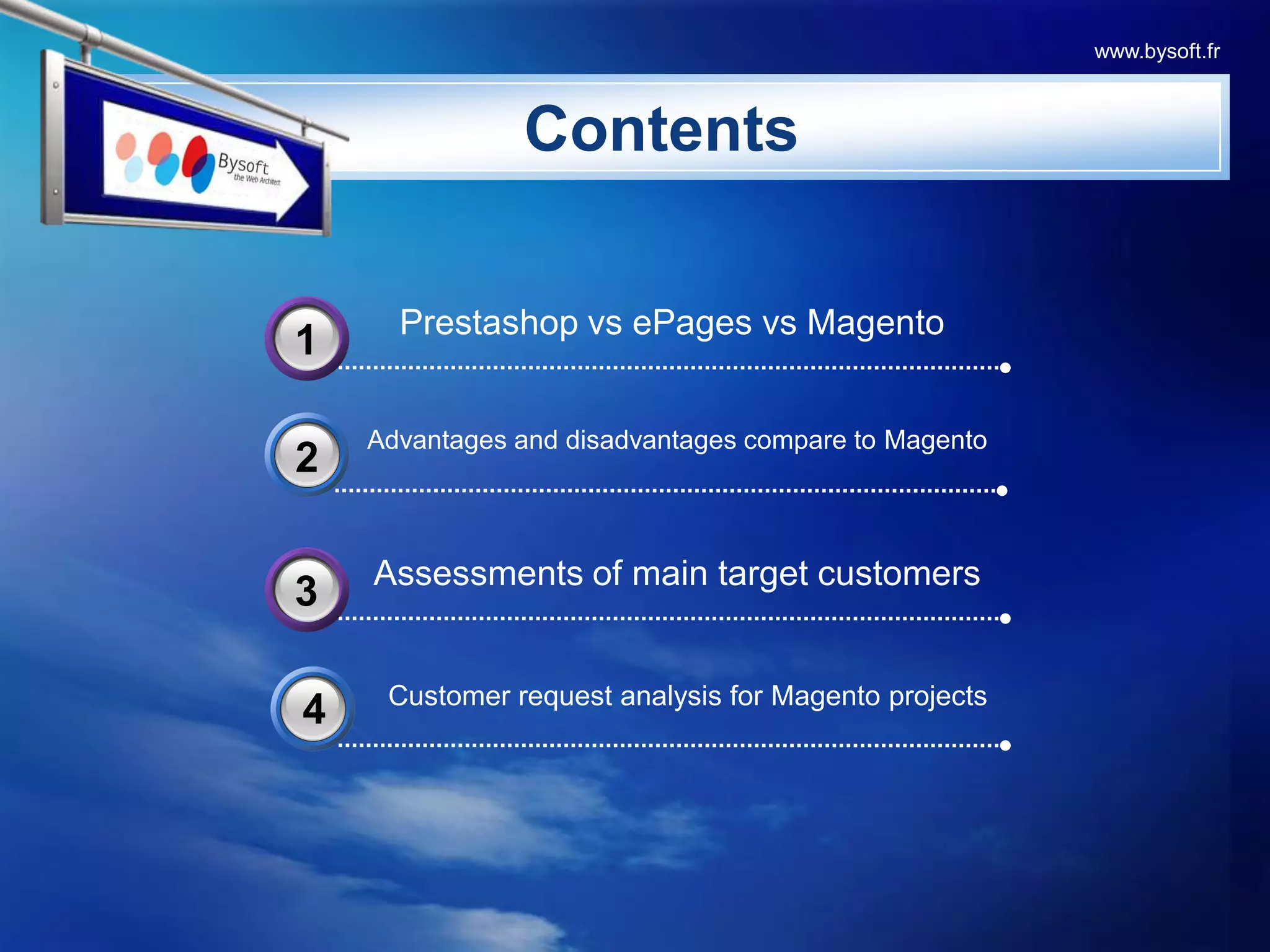 The document compares Prestashop, ePages, and Magento ecommerce platforms. Magento has more features but is more difficult to install than Prestashop. Prestashop has a lighter file size and simpler installation requirements. ePages does not require installation but has fewer customization options and is not free. The document assesses each platform's strengths and weaknesses and identifies Magento as best for customers needing multi-website management and customization, while Prestashop and ePages may better suit simpler stores.