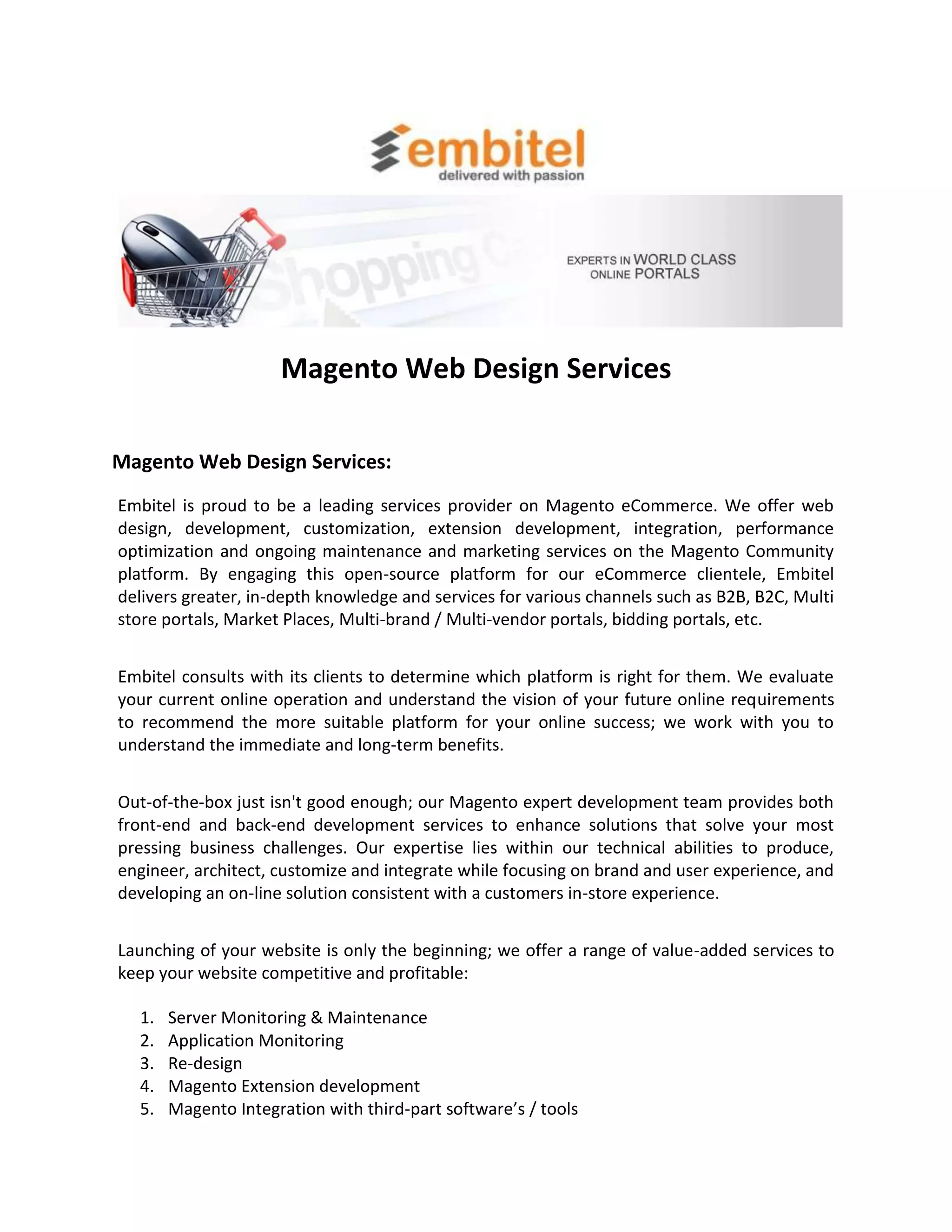 Embitel provides Magento web design, development, customization and integration services. They consult with clients to determine the best Magento platform for their needs. Their expert development team enhances solutions to solve business challenges through front-end and back-end development focused on brand and user experience. Embitel also offers ongoing services to keep websites competitive and profitable, including server monitoring, application monitoring, re-designs, extension development and integration with third-party tools.
