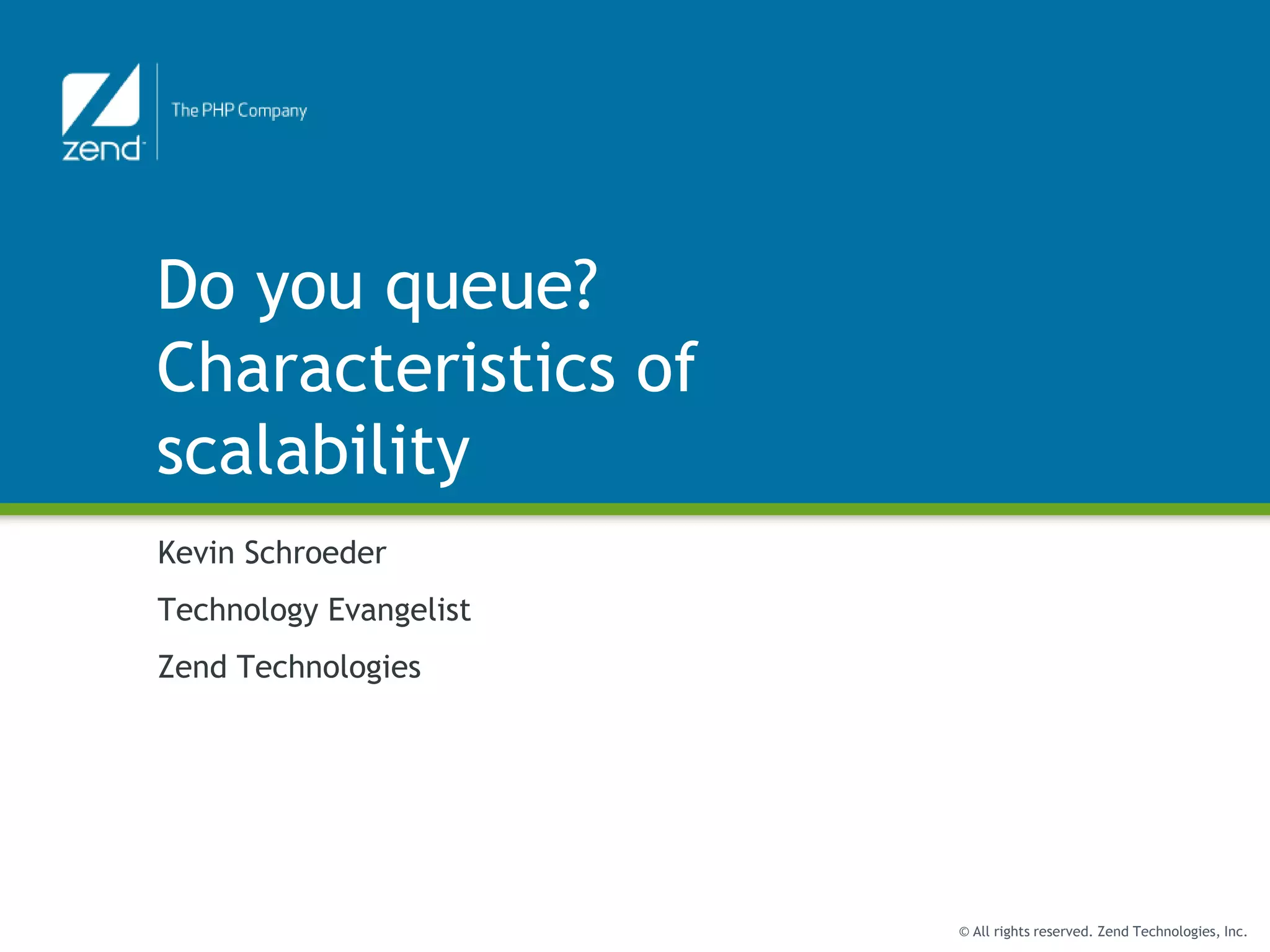 This document discusses using queues to improve the scalability of PHP applications. Queues allow asynchronous and distributed processing of tasks to improve performance and allow applications to handle more traffic. The document recommends using Zend Server's job queue to process long-running or asynchronous tasks outside the main request. It provides an example of using the job queue to asynchronously process payments in Magento to improve the customer experience.