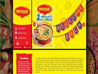 This document summarizes the history and safety issues of Maggi noodles in India. It discusses how Maggi was banned in several states in 2015 due to high lead levels found in some products. This led to major consequences for Nestle including large financial losses, damage to its brand reputation, and lawsuits. The document also describes how Snapdeal later launched a promotion called "Maggi Welcome Kit" to celebrate Maggi's return to the Indian market.