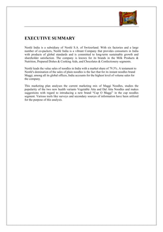 This marketing plan analyzes Maggi Noodles' current marketing mix in India. It studies the popularity of two new healthy variants - Vegetable Atta and Dal Atta Noodles. The plan makes suggestions for introducing a new "Cup O Maggi" brand in the cup noodles segment. Various tools like surveys and secondary research were used. Nestle India leads the instant noodles market in India with Maggi having a 79.3% market share. The plan evaluates introducing improvements to the Dal Atta variant and a new Cup O Maggi product along with packaging changes to further market share.