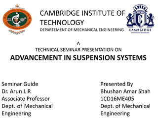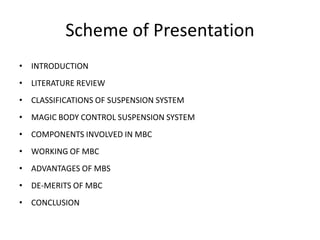 The document discusses the Magic Body Control suspension system, which is an advanced active suspension system. It consists of a stereo camera, sensors, electronic control unit, hydraulic servo mechanisms, and electronically controlled shock absorbers. The stereo camera scans the road surface ahead and provides this information to the ECU. The ECU then controls the hydraulic mechanisms and shock absorbers to adjust the suspension based on the road conditions, improving comfort and handling. The system has advantages like reduced pitching and rolling of the vehicle. It allows the driver to select different suspension modes like comfort and sport.
