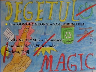Documentul prezintă un dialog jucăuș al unui mic degețel care îi învață pe copii să urmeze instrucțiuni pentru a-i aduce fericire, cum ar fi stingerea luminii sau oprirea apei curgătoare. De asemenea, subliniază importanța reciclării și protecției mediului prin activități precum desenul și modelarea. Mesajul final este încurajator, îndemnând la acțiuni responsabile pentru un mediu mai curat.