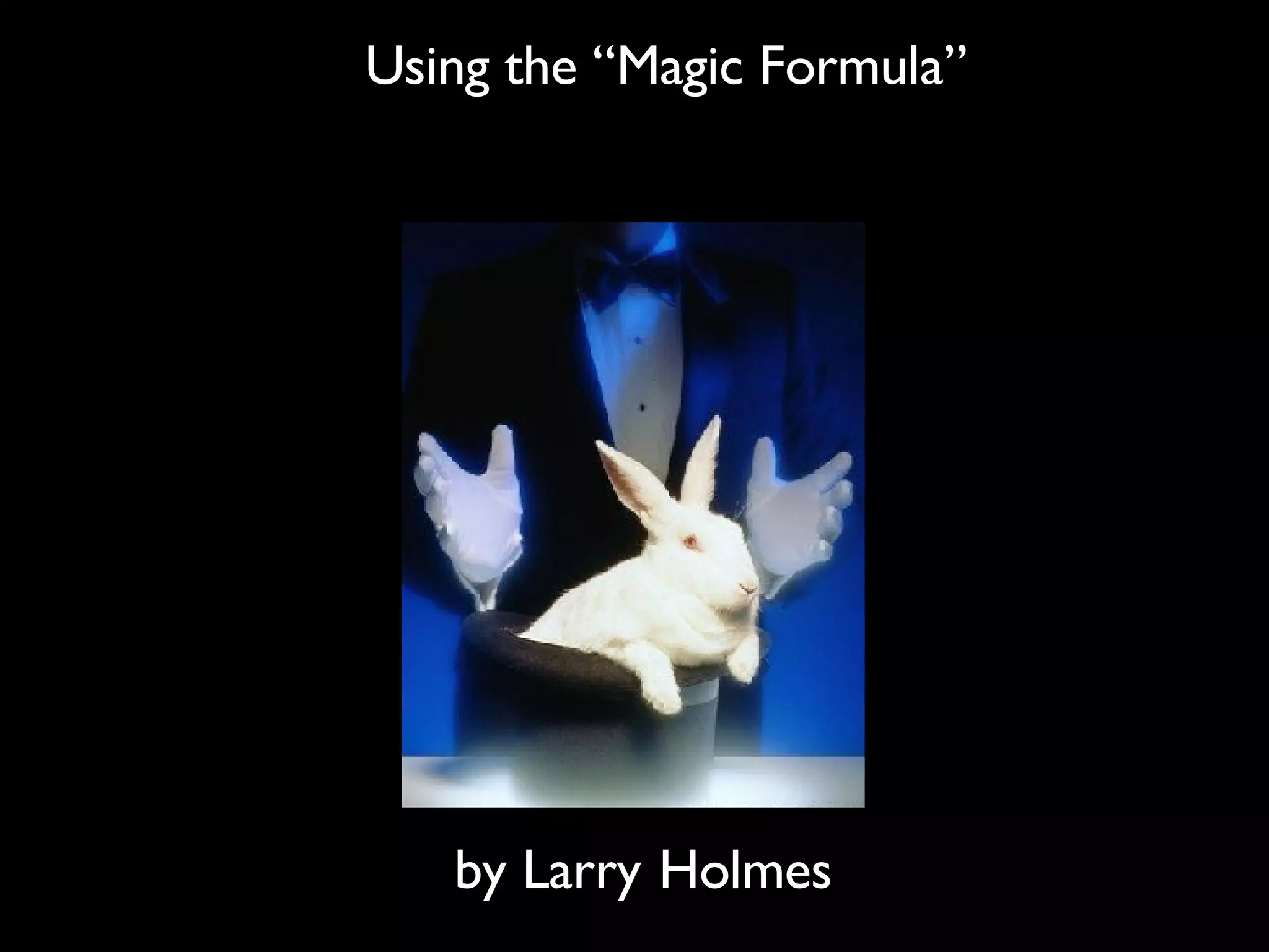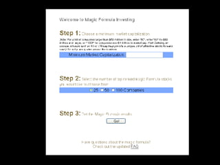 The document discusses the 'magic formula' investment strategy by Joel Greenblatt, emphasizing buying good companies at bargain prices based on key metrics like return on capital and earnings yield. It highlights that historically, this strategy yielded significant returns but has periods of underperformance compared to market averages. The document also provides a step-by-step guide for implementing the magic formula in personal investment portfolios.