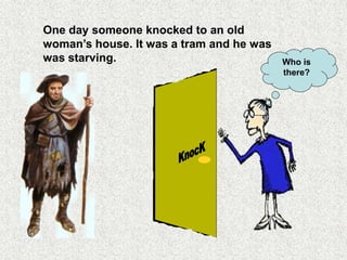 An old, mean woman living alone was skeptical of a starving tramp who came to her door asking for food and water. He claimed to have a magic leaf that could make soup. She reluctantly allowed him into her kitchen and provided a pot of water and some spices. When the soup was ready and they sat down to eat, the tramp revealed the "magic" leaf was just a common bay leaf. The soup was delicious and the tramp had tricked the woman into showing kindness to a stranger through harmless deception.