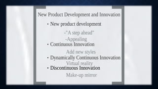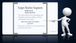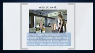 Magic Mirror is developing two smart mirror products - a virtual dressing room mirror for wedding boutiques and a smart home mirror. The virtual dressing room mirror allows brides to virtually try on 20 wedding gowns using 3D body scanning and fitting technology. This alleviates stress for brides during dress selection. The smart home mirror features a touchscreen display, widgets for weather, news, and more. It is powered by a Raspberry Pi and uses Kinect technology. Magic Mirror aims to target luxury consumers in major cities with a marketing strategy using social media, influencers, displays, and events. The presentation provides details on the products, pricing, promotion, and marketing communication plan.
