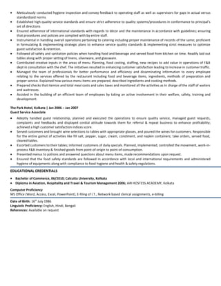 Biplob Bose is a hospitality professional with over 10 years of experience in food and beverage operations and guest relations. He is currently an Upper Division Assistant and is seeking a challenging new position. He has strong skills in restaurant operations, kitchen management, customer service, and facility management. Bose strives for high quality service and resolving customer issues to ensure satisfaction and loyalty. He is adept at supervising teams and implementing strategies to improve efficiency.