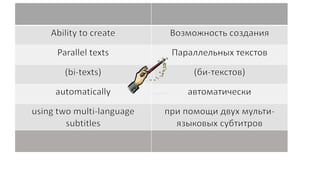 Документ описывает возможности сайта http://magicsub.com, который позволяет пользователям смотреть видео с локальных компьютеров через веб-браузер с поддержкой двойных субтитров. Он предлагает функции перевода субтитров на лету, создания собственных субтитров из существующих транскриптов и возможности участия пользователей в процессе перевода. Эти функции предоставляют бонусы для улучшения зрительского опыта.