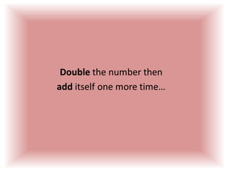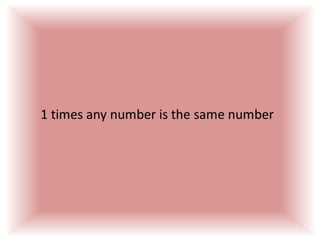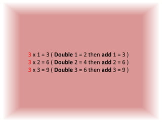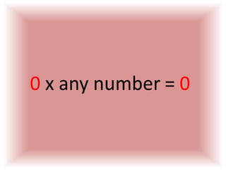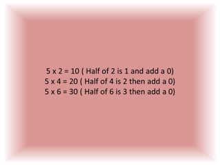 The document provides tips for multiplying numbers 0-12. It explains tricks for multiplying by each number, such as doubling for 2, cutting in half and dropping the decimal for odd numbers, cutting in half and adding a 0 for even numbers, and duplicating the number for 11. The tricks are intended to make multiplication easier to learn.