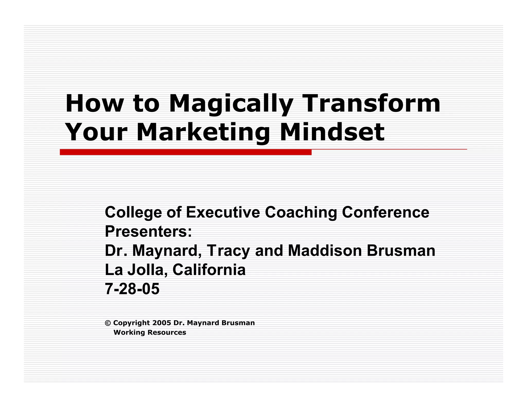 The document outlines strategies for transforming the marketing mindset, emphasizing the importance of confidence, communication, and connection in marketing efforts. It provides tips for overcoming common fears and limiting beliefs related to marketing, encourages self-discovery of unique strengths, and stresses the value of building relationships with potential clients. Additionally, it lists practical marketing tips and resources to aid in developing effective marketing practices for coaches.