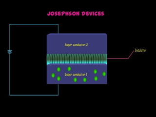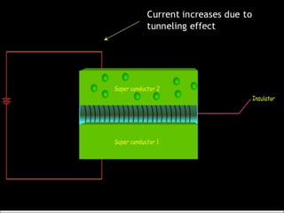 Maglev trains use magnetic levitation to float along tracks without friction for very fast travel up to 250 mph. They require newly built tracks with magnet systems as they cannot operate on conventional rails. While maglev trains consume less energy and travel faster than normal trains, their infrastructure costs around $5 million per mile to build, making the initial investment very high. The Josephson effect describes how electrons can tunnel through thin insulating barriers between two superconductors, resulting in electric currents even without an applied voltage.