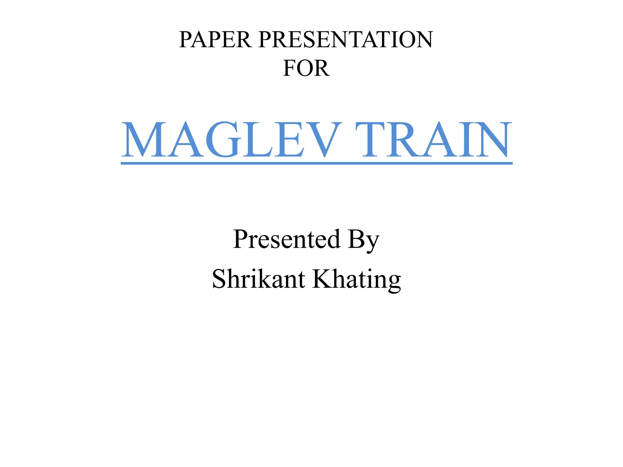 The document presents a paper on maglev trains, detailing their operating principles, features, and advantages over conventional trains. Maglev trains utilize magnetic levitation for noiseless, frictionless travel, achieving speeds over 300 miles per hour, while contributing to reduced pollution. The paper also discusses potential disadvantages, current situations, and concludes on the viability of maglev as a future transportation alternative.
