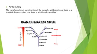 Partial melting occurs when a portion of a solid rock melts due to changes in pressure, heat, or volatile content. Magmatic differentiation is the process by which an originally uniform magma evolves into different igneous rock types. There are several processes involved in magmatic differentiation, including fractional crystallization where early crystals separate from the liquid, flowage differentiation related to flow patterns in magma channels, and crystal zoning where crystal compositions change during crystallization.