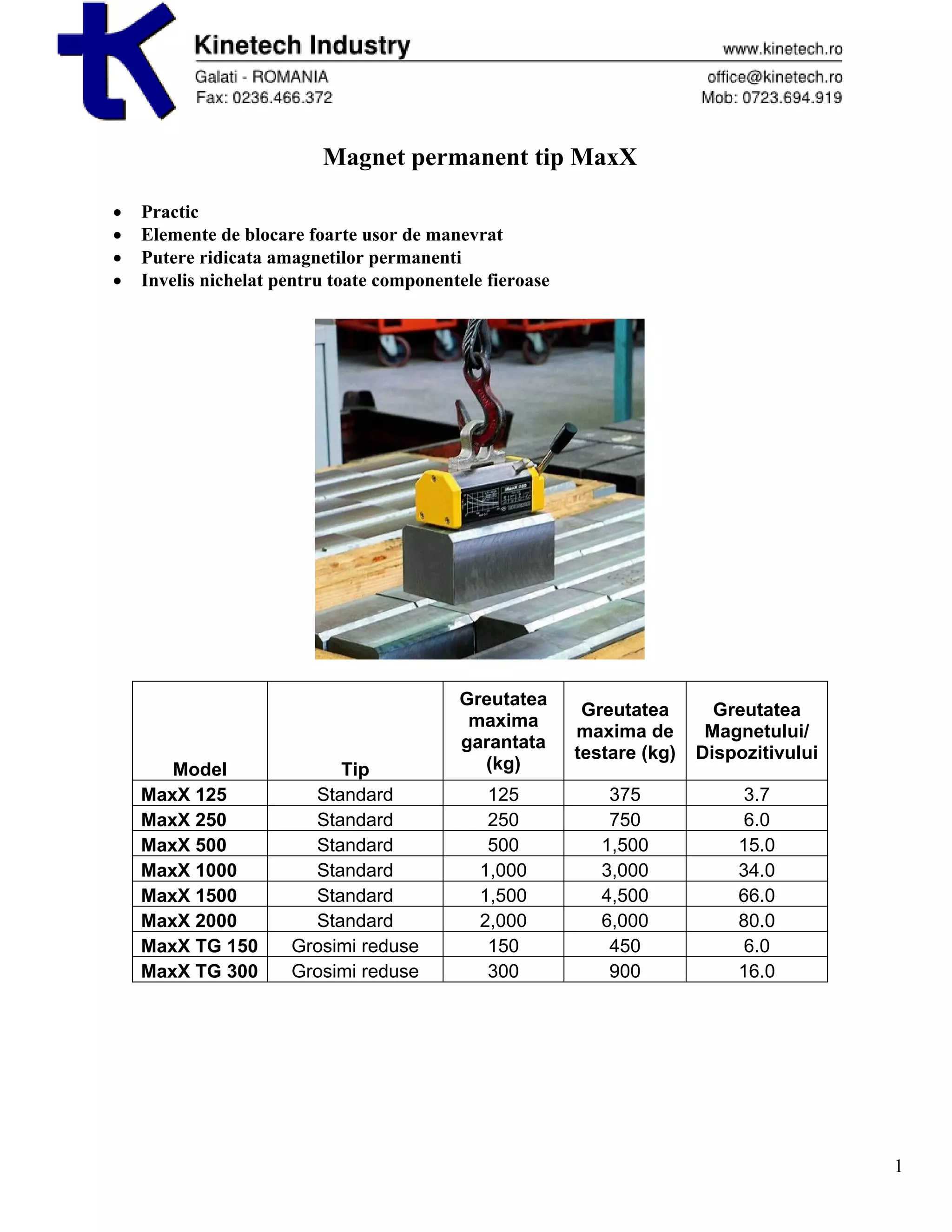 MaxX • Practic • Elemente de blocare foarte usor de manevrat • Putere ridicata amagnetilor permanenti • Invelis nichelat pentru toate componentele fieroase Greutatea Greutatea Greutatea maxima maxima de Magnetului/ garantata testare (kg) Dispozitivului Model Tip (kg) MaxX 125 Standard 125 375 3.7 MaxX 250 Standard 250 750 6.0 MaxX 500 Standard 500 1,500 15.0 MaxX 1000 Standard 1,000 3,000 34.0 MaxX 1500 Standard 1,500 4,500 66.0 MaxX 2000 Standard 2,000 6,000 80.0 MaxX TG 150 Grosimi reduse 150 450 6.0 MaxX TG 300 Grosimi reduse 300 900 16.0 1