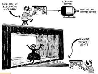 The document discusses magnetic amplifiers, which are electromagnetic devices that amplify electrical signals without any moving parts. They work by using the principle of magnetic saturation of transformer cores to control the impedance of AC windings. Magnetic amplifiers were developed in the late 19th century and were widely used during World War II for applications like controlling rocket frequencies. They were also used for voice modulation in early radio, automatic landing systems in aircraft, and as potential switching elements in early computers due to advantages like reliability and ability to sum multiple inputs. While outdated today, magnetic amplifiers were an important early alternative to vacuum tubes.