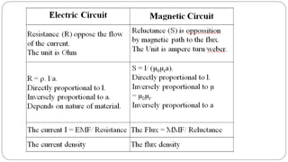 3. In a magnetic circuit, magnetic flux is produced by current in a wire and measured in Webers. Magnetomotive force (MMF) drives flux and is measured in Ampere-turns. Permeability indicates a material