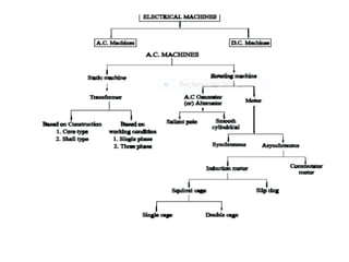 This document discusses electromagnetic principles and magnetic circuits. It begins by defining magnets and magnetic fields, including magnetic lines of force and flux. It then discusses electromagnetic relationships such as magnetic flux, reluctance, permeability and hysteresis. It describes different types of magnetic circuits including simple, composite and parallel circuits. It also covers electromagnetic induction, including Faraday's and Lenz's laws. Induced emf can be dynamically or statically induced. Core losses from hysteresis and eddy currents are also summarized.