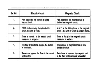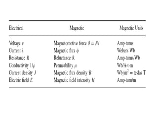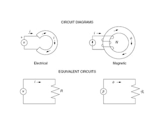 This document discusses magnetic circuits and electromagnetic induction. It defines key terms like magnetic flux, magnetomotive force, reluctance, self-inductance, and mutual inductance. Faraday's laws of induction state that an electromotive force (EMF) is induced in a coil when the magnetic flux through the coil changes. Lenz's law specifies that the induced EMF will oppose the change that created it. Magnetic circuits can be modeled similarly to electric circuits, with magnetomotive force, magnetic flux, and reluctance analogous to voltage, current, and resistance.