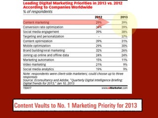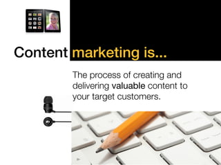 The document discusses strategies for effective content marketing to attract and engage customers, highlighting the importance of delivering valuable content that builds trust. Key steps include defining customer objectives, understanding buyer needs, creating a relevant content plan, and promoting published material effectively. Additionally, it emphasizes the need for measurement and adaptation to ensure ongoing success in attracting and retaining customers.