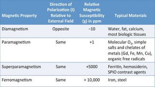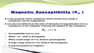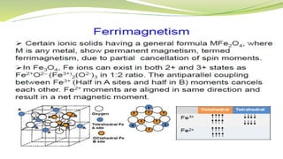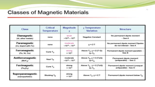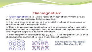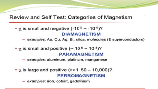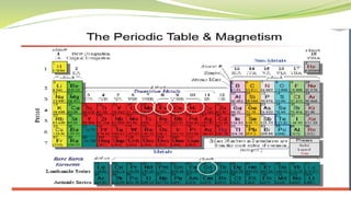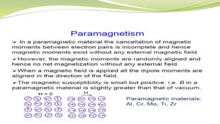 This document discusses different types of magnetic and non-magnetic materials. It defines magnetic materials as those attracted by magnetic fields, such as iron, nickel, and cobalt, while non-magnetic materials are not, like wood, rubber, and plastics. Magnetic materials are further divided into soft magnetic materials, which do not retain magnetism without a magnetic field, and hard magnetic materials, which do retain magnetism without a field. The document also discusses magnetic fields, magnetic induction, magnetic moments, and different types of magnetism including diamagnetic, paramagnetic, and ferromagnetic.