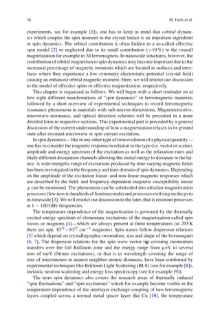 This document reviews experimental approaches to analyze spin wave dynamics in ferromagnetic nanoscale structures. It describes recent developments in frequency- and field-swept spectroscopy to determine the resonant response of nanoscale ferromagnets. It also describes time-resolved measurements in the GHz frequency and picosecond time domains to analyze the relaxation of magnetization after microwave excitation. Examples are presented for analyzing and manipulating different mechanisms for the relaxation of magnetization into its ground state.