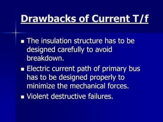 This document discusses magneto optical current transformers (MOCTs). MOCTs use the Faraday effect to measure current optically without breaking the current path. They have several advantages over conventional current transformers, such as providing insulation, withstanding high fault currents without saturation, and having no electromagnetic interference. A MOCT consists of a sensor head near the current carrying conductor that uses polarized light, a signal processing unit, and fiber optic cables connecting them. The sensor measures the rotation of the light's polarization due to the Faraday effect to determine current magnitude. MOCTs are well-suited for outdoor applications and provide more accurate current measurements than conventional transformers.