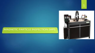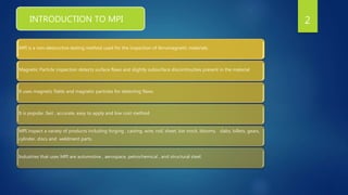 Magnetic Particle Inspection (MPI) is a non-destructive testing method that uses magnetic fields and particles to detect surface and near-surface flaws in ferromagnetic materials, commonly employed in industries such as automotive and aerospace. The process involves magnetizing the component, applying iron particles, and interpreting the resulting magnetic indications to identify defects. Despite its advantages like cost-effectiveness and the ability to detect small flaws, MPI has limitations including its ineffectiveness on non-ferrous materials and the requirement for relatively smooth surfaces.