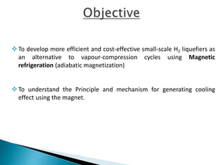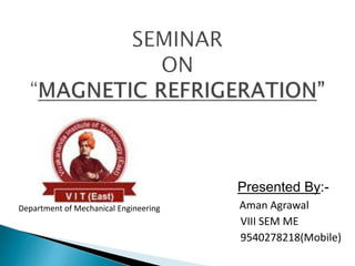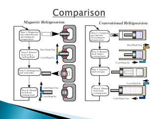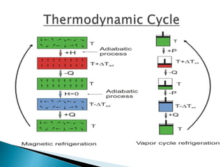 This document summarizes magnetic refrigeration technology. It discusses how magnetic refrigeration uses the magnetocaloric effect to produce cooling through applying and removing a magnetic field to magnetic materials. The document outlines the basic thermodynamic cycle of magnetic refrigeration and compares it to a vapor compression cycle. It also discusses some promising magnetocaloric materials and challenges to overcome like reducing costs and improving efficiency to enable widespread commercial applications of magnetic refrigeration.