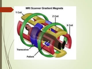 This document provides an overview of magnetic resonance imaging (MRI). It discusses the history of MRI, including key contributors like Felix Bloch and Edward Purcell. It describes the main components of an MRI machine, including the main magnet, gradient coils, RF coils, shielding, and computers. It explains the physics principles behind MRI such as magnetic fields, precession, relaxation, and gradients. It also covers MRI signal types, sequencing, tissue contrast, image quality, artifacts, and safety considerations.