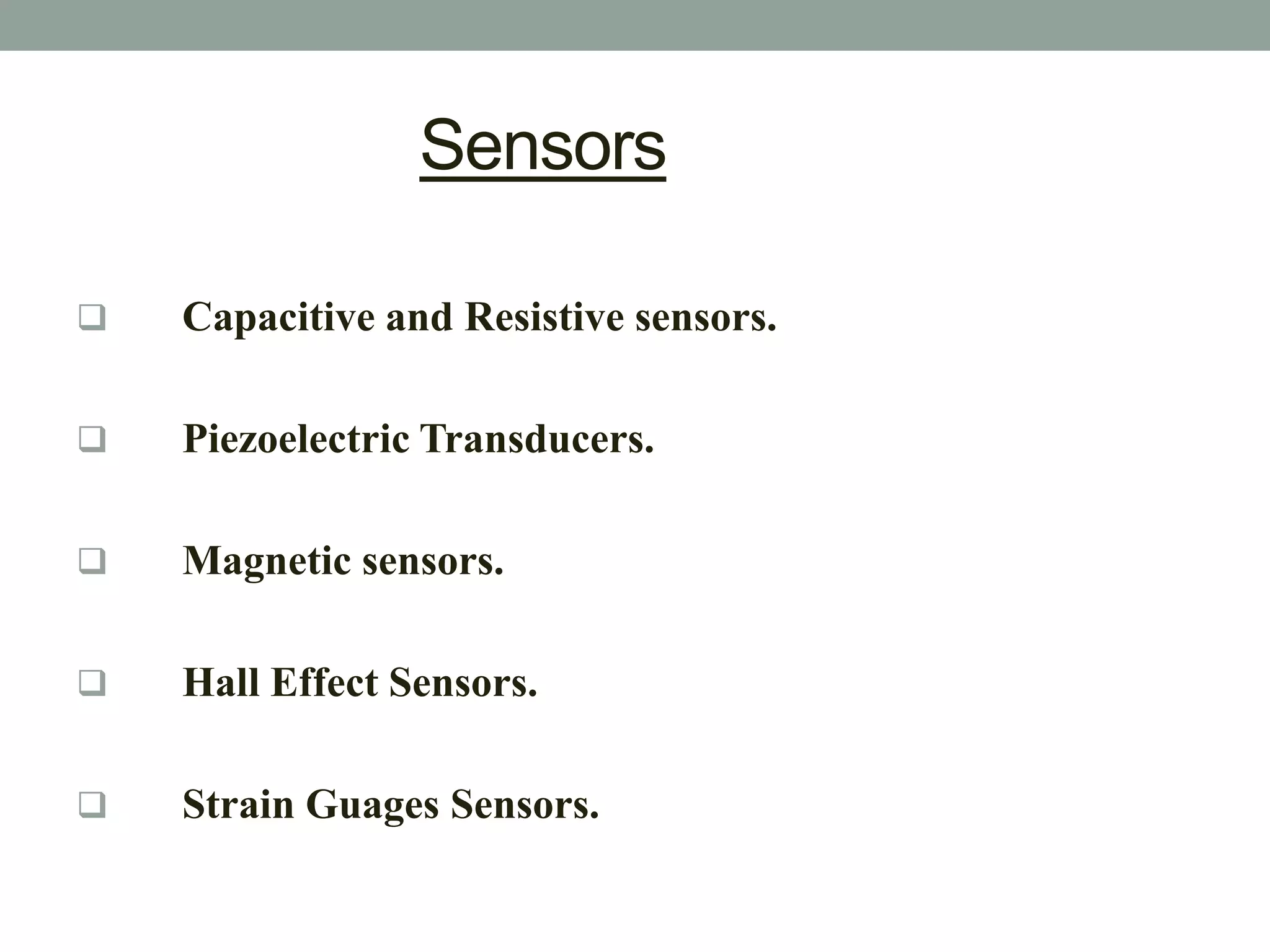 The document discusses different types of sensors including resistive, capacitive, piezoelectric, magnetic, and strain gauge sensors. It provides details on resistive sensors and their major types like potentiometers, strain gauges, thermistors, and light dependent resistors. The document also describes capacitive sensors, piezoelectric transducers, magnetic sensors like Hall effect sensors, and variable reluctance sensors. Finally, it covers strain gauge sensors, their working, and applications.
