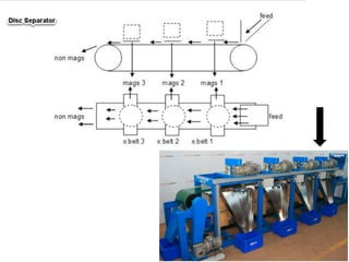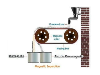 Magnetic separation is a process that uses magnets to separate ferromagnetic and paramagnetic materials from other materials. Ferromagnetic materials require relatively weak magnetic fields and are typically separated using permanent magnets, while paramagnetic materials require stronger magnetic fields that can only be produced by electromagnets. Magnetic separation has applications in mineral processing, such as removing tramp iron from ores or separating magnetic minerals from less magnetic ones. There are different types of magnetic separators suited to various materials and particle sizes, including drum separators, cross belt separators, and high-intensity separators used for paramagnetic materials.