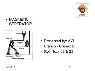 This document summarizes different types of magnetic separators. It describes Edison, Ball Norton, magnetic drum, roller type, gravity feed, and magnetic coolant separators. Magnetic separation is a process that uses magnetic force to separate magnetically susceptible material from a mixture. Various industries such as glass, ceramic, chemical, fertilizer, plastic, food, mining, and pharmaceuticals use different types of magnetic separators to separate ferrous metals from dry or liquid products.