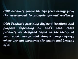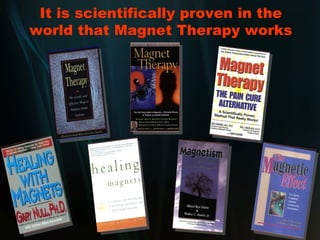 The document discusses the concept of magnetic energy and its significance in health, emphasizing that the body relies on magnetic energy for cellular function and overall well-being. It presents bio-magnetic therapy as a promising therapeutic intervention, highlighting its historical use and benefits such as improved circulation, pain relief, and mental stability. Additionally, the document introduces Bio-Amega Global, a company promoting health and wealth through innovative magnetic products and therapies.