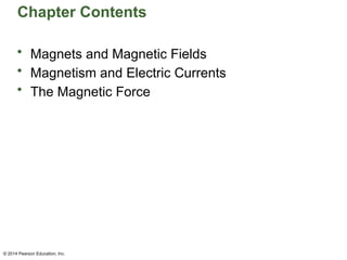 Chapter 22 discusses magnetism, magnetic fields, and the connection between electricity and magnetism, highlighting the basic properties of magnets, such as poles and their interactions. It explains how electric currents create magnetic fields and introduces the concept of solenoids as electromagnets. Additionally, the chapter covers Earth's magnetic field, its historical reversals, and the principles governing magnetic fields generated by current-carrying wires.