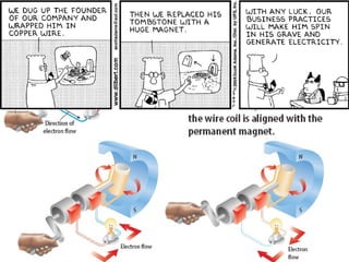 Magnetism is produced by magnets which have north and south poles and magnetic field lines. The earliest magnets were naturally occurring lodestone. Magnets attract opposite poles and repel like poles. The Earth itself acts like a giant bar magnet due to its nickel-iron core. Magnetic substances are composed of small magnetic domains that align when exposed to an external magnetic field. Electricity and magnetism are related because electric currents produce magnetic fields. Electromagnets are coils of wire that produce strong magnetic fields when electric current passes through. Galvanometers use electromagnets to measure electric current. Electric motors convert electric current into rotational motion using electromagnetic induction. Generators also use electromagnetic induction to produce electric current from mechanical motion. Direct