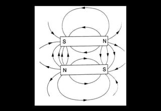 This document discusses magnetism and magnetic fields. It describes testing magnets by bringing specimens near magnet poles to observe attraction or repulsion. Induced magnetism occurs when an unmagnetized material becomes a magnet when near a permanent magnet. The document also discusses the theory of magnet domains, methods of magnetization and demagnetization, and plotting magnetic field lines. It provides examples of magnetic field patterns for single and multiple magnets, including the neutral point between magnets with like poles facing. Finally, it compares the magnetic properties of iron and steel.