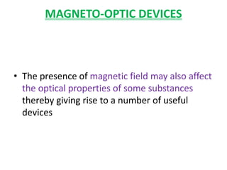 This document discusses magneto-optic and acousto-optic effects. It explains that the Faraday effect causes a rotation of the plane of polarization of light passing through a material under a magnetic field. This effect is used in optical isolators. The document also discusses using magneto-optics for computer memory storage. It then explains that the acousto-optic effect causes a change in refractive index from strain waves, creating a diffraction grating. This can diffract light in either the Raman-Nath or Bragg regimes, depending on the thickness of the modulated region.
