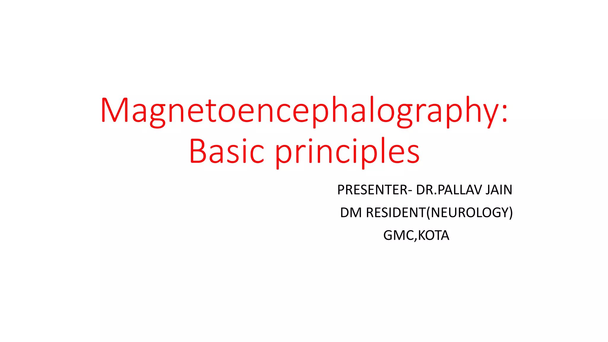 MEG measures the magnetic fields generated by electric currents in the brain. It has very high temporal resolution and good spatial resolution when combined with MRI. MEG is more sensitive than EEG to superficial cortical activity due to the way magnetic fields propagate. It is useful for localizing epileptic foci prior to epilepsy surgery and mapping eloquent cortex. Source analysis is performed to estimate the location of cortical generators. MEG provides better spatial resolution than EEG for localizing interictal epileptic discharges.