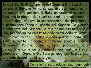 Il documento riporta letture e riflessioni per la terza domenica di Avvento, evidenziando il messaggio di gioia e speranza portato dallo spirito del Signore. Si sottolinea l'importanza della gioia, della preghiera continua e della gratitudine, con un richiamo a rimanere saldi nella fede. Inoltre, il testo presenta la figura di Giovanni Battista come testimone della luce e preparatore della via del Signore.