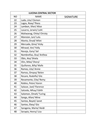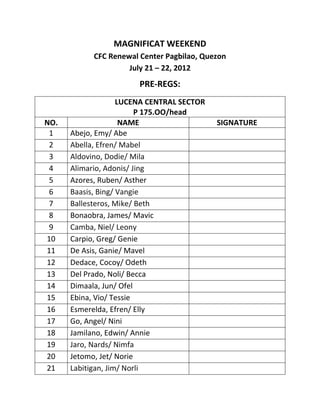 This document contains registration information for a Magnificat Weekend to be held on July 21-22, 2011 at the CFC Renewal Center in Pagbilao, Quezon. It lists the names and signatures of over 200 people registering from various sectors - Lucena Central, South Sector 1, North Sector, and East Sector. It also includes sections for single registrants from some of these sectors. The registration fee is 175 pesos per head.