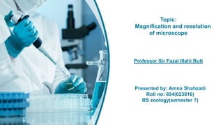 This presentation summarizes key concepts about microscopes and microscopy. It defines important terminology like magnification, resolution, resolving power, and numerical aperture. It explains that magnification increases apparent size but resolution is the ability to distinguish between two points. Numerical aperture depends on the angle of light collection and refractive index. The limit of resolution is calculated as the wavelength of light divided by two times the numerical aperture, allowing objects 0.2 micrometers apart to be distinguished under optimal conditions.