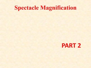 This document discusses different types of magnification used in low vision aids and optical devices. It describes relative distance magnification (RDM) as increasing the apparent size of an object by bringing it closer. Relative size magnification (RSM) increases an object's size while keeping it in the same position. Projection magnification enlarges an image projected on a screen. Angular magnification increases the visual angle subtended by the object. The document also discusses magnification in microscopes, telescopes, and clinical devices like slit lamps, and how magnification is achieved in low vision aids through various combinations of RDM, RSM, and angular magnification.
