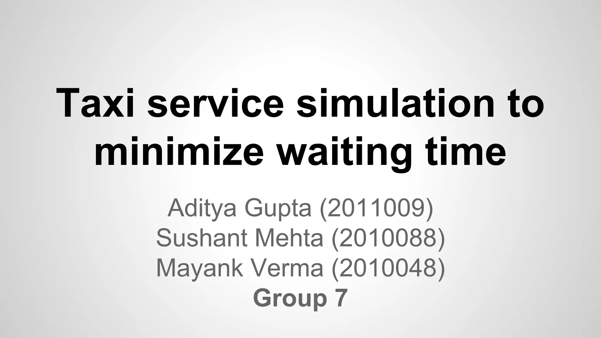 The document discusses a simulation for optimizing taxi service operations to minimize average waiting time in urban environments with varying densities. It presents multiple strategies, including greedy algorithms and predictive methods, and evaluates their performance through simulations using NetLogo. Results indicate that preemptive strategies consistently outperform others, especially under conditions of reduced resources and high demand.