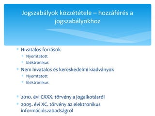Hivatalos források NyomtatottElektronikus Nem hivatalos és kereskedelmi kiadványok Nyomtatott Elektronikus 2010. évi CXXX. törvény a jogalkotásról 2005. évi XC. törvény az elektronikus információszabadságról Jogszabályok közzététele – hozzáférés a jogszabályokhoz