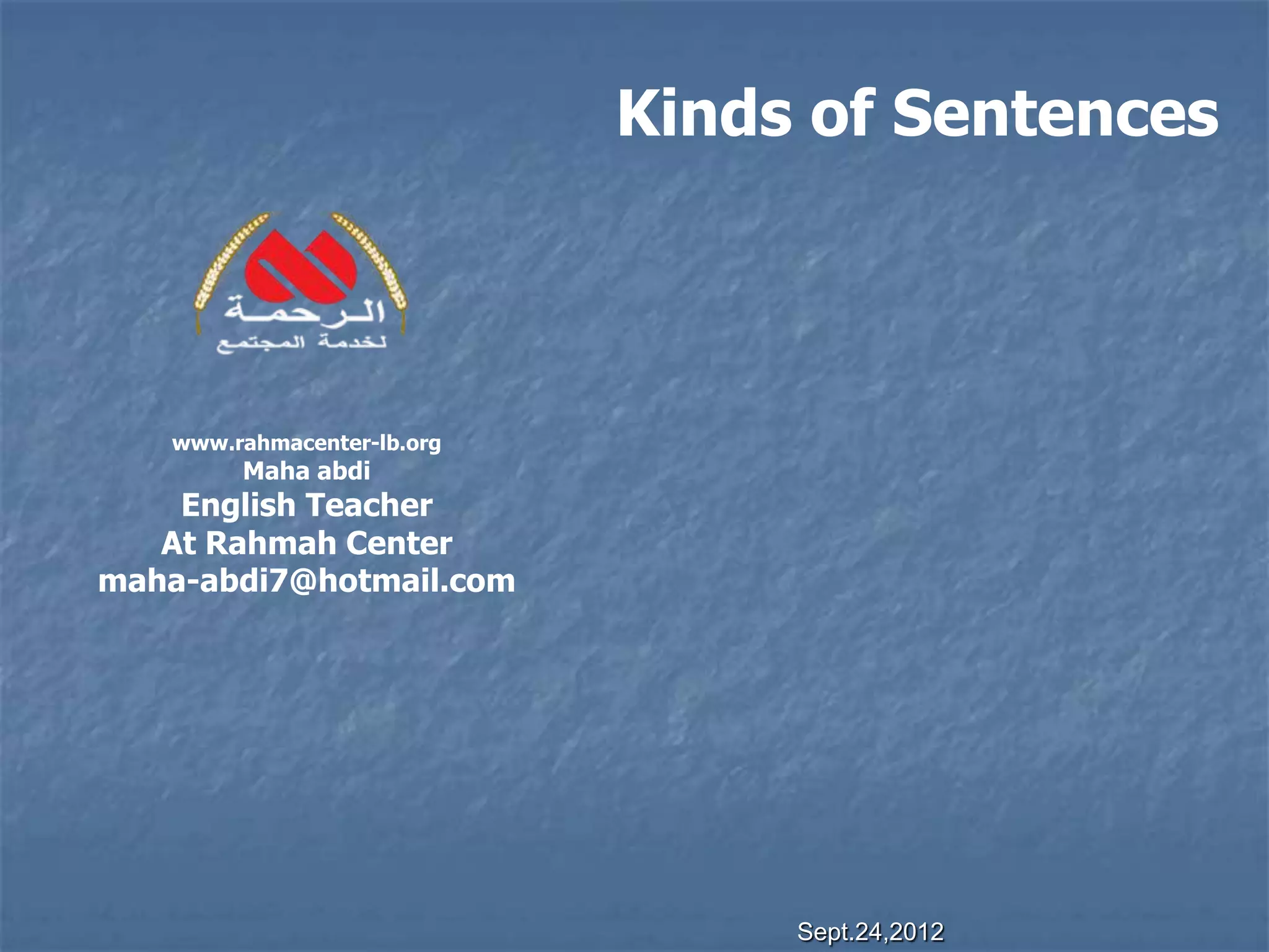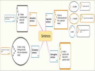 This document discusses the four kinds of sentences: declarative, interrogative, exclamatory, and imperative. Declarative sentences make statements, interrogative sentences ask questions, exclamatory sentences show strong feeling, and imperative sentences give commands. The document provides examples of each kind of sentence and has students identify the type of each example sentence.