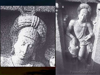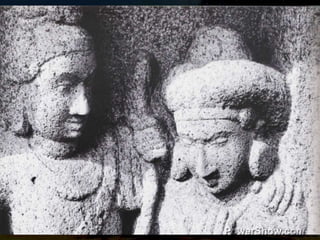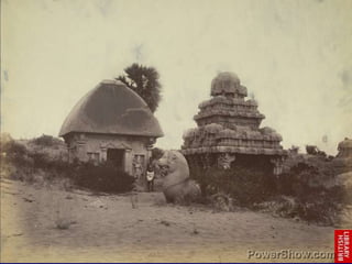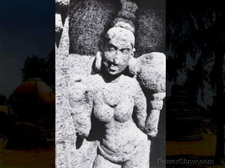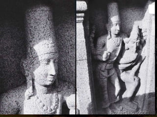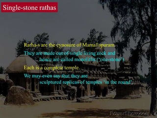 The document discusses the Pallava rathas, monolithic temples carved from single rock in Mamallapuram, showcasing innovative temple architecture and sculpture. It highlights the unique designs, unfinished status of many rathas, and the skilled craftsmanship involved in their creation, emphasizing the significance of these structures in the evolution of temple architecture in southern India. The sculptures within the rathas represent various deities and human figures, providing insight into the artistic and cultural expressions of the Pallava period.