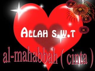 Dokumen tersebut membahas tentang cinta (mahabbah) dalam perspektif Islam. Terdapat tiga tingkatan cinta yaitu cinta utama kepada Allah, cinta menengah kepada orang tua dan sanak saudara, dan cinta rendah kepada harta dan nafsu. Cinta menengah harus tetap berada di bawah cinta utama kepada Allah. Tokoh yang memperkenalkan konsep mahabbah adalah Rabiah al-Adawiyah, seorang zahidah dari Irak