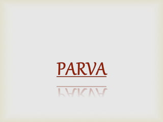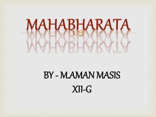 This document provides an overview of the Hindu epic Mahabharata. It discusses that the epic was composed in Sanskrit between 300 BC and 300 AD, making it one of the longest works of literature in the world. It recounts a historical war that took place around 1000 BC between the Kauravas and Pandavas dynasties. While some characters and events may be based on history, much of the epic contains additional myths and teachings rather than a literal historical account. The document also examines some key characters, like Yudhisthira, and themes around caste discrimination in episodes like that of Eklavya.